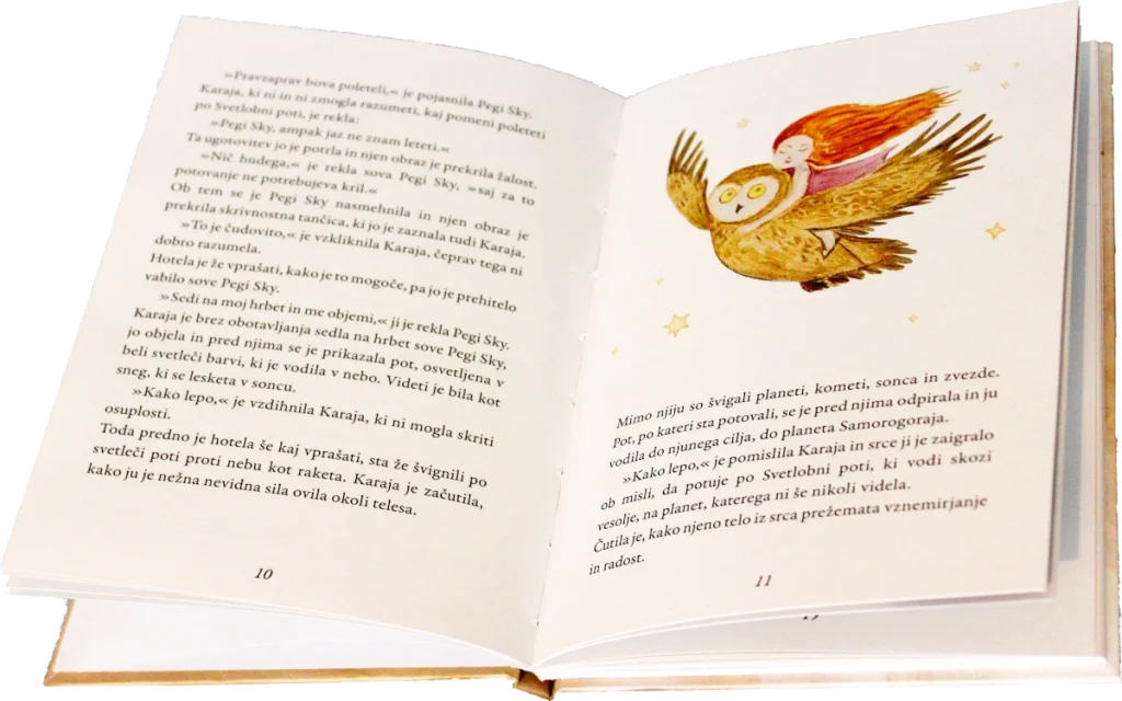Pravljica govori o deklici, ki s sovo Pegi Sky po Svetlobni poti poleti na planet Samorogoraja. Tam si ogleda gledališko igro in skupaj z gledalci pomaga iskati pot domov samorogcu Almarisu. Almaris se je izgubil na čarobnih toboganih. Dogodivščina sledi dogodivščini in vsaka prinaša pasti in nevarnosti. Ob stalnem napetem trepetanju in iskanju rešitev Karaja odkriva nov svet.